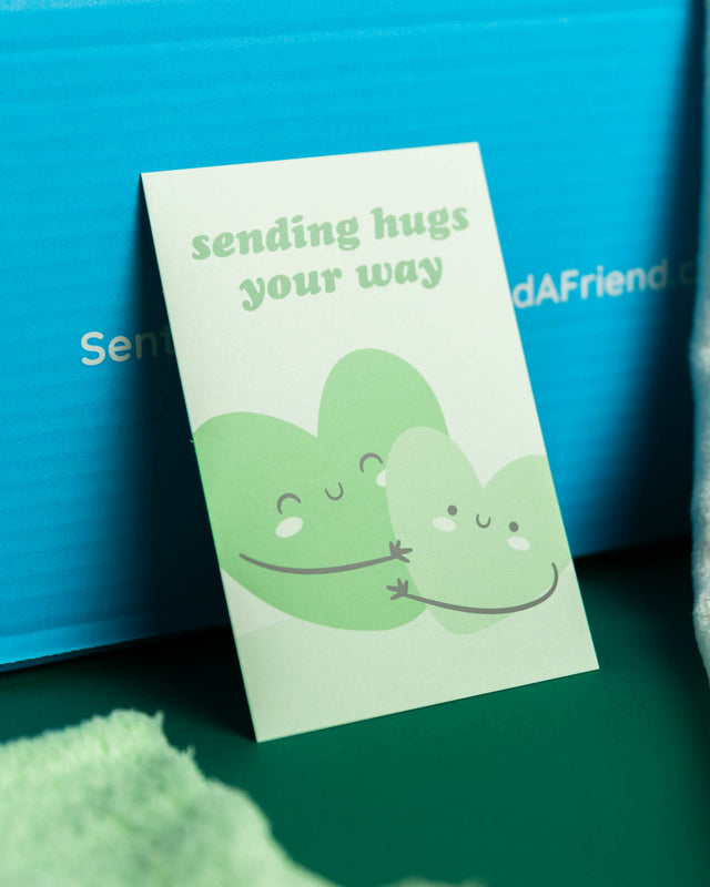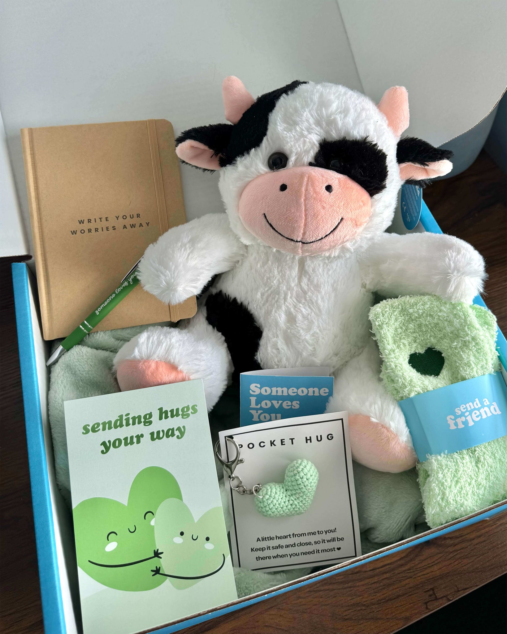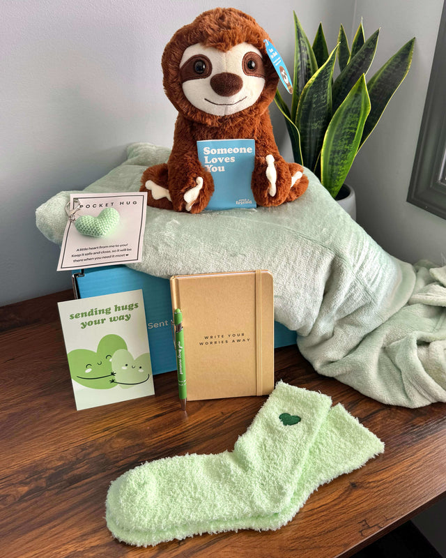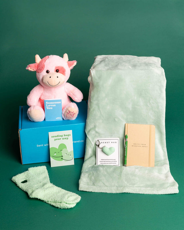When words fall short, offer a gentle embrace for life's hardest moments. This bundle features the fluffy friend of your choice, a cozy blanket, fuzzy socks, journal and pen, and a small pocket hug to carry anywhere.