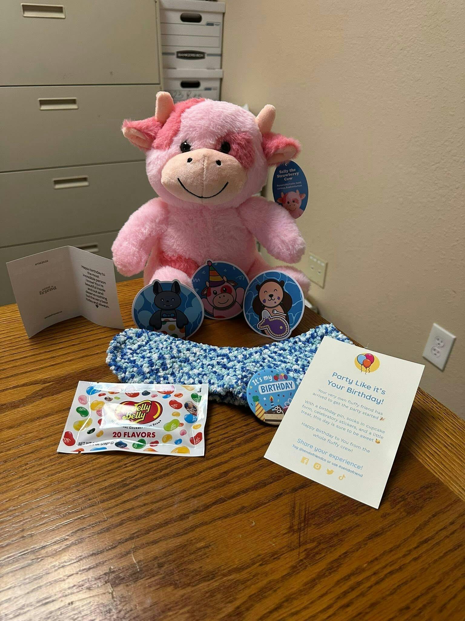 I live in Alaska and my 94 yr old mom lives near my sister in Florida. My sister was away on a trip and I wanted to send he something cute and special, so when I saw "Sally the Strawberry Cow" on one of your Facebook ads I knew I had to send her to my mom since her name is Sally. She absolutely loves it and shows it off to everyone.